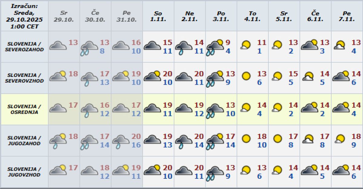 Po napovedih meteorologov Agencije RS za okolje (Arso) bo v zadnjih dnevih oktobra vreme pri nas pod vplivom jugozahodnega vetra, ki bo nad Slovenijo prinašal vlago iznad Sredozemlja. To pomeni tudi padavine, ki jih bo do konca tedna največ v zahodni polovici Slovenije, najmanj pa na severovzhodu.