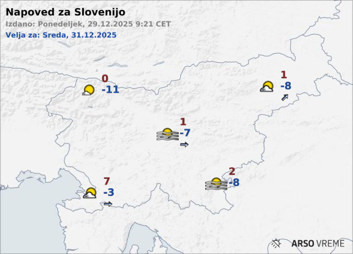 Bo pa še precej hladnejše jutro pred silvestrskim slavjem, torej 31. decembra zjutraj. Po prehodu hladne fronte se bo namreč razjasnilo, v večjem delu nižin pa bomo beležili temperature od -5 do -10 stopinj Celzija, na območju mrazišč celo približno -15 stopinj Celzija, je opozoril Medved. Pod ničlo se bodo spustile tudi temperature na obali.
