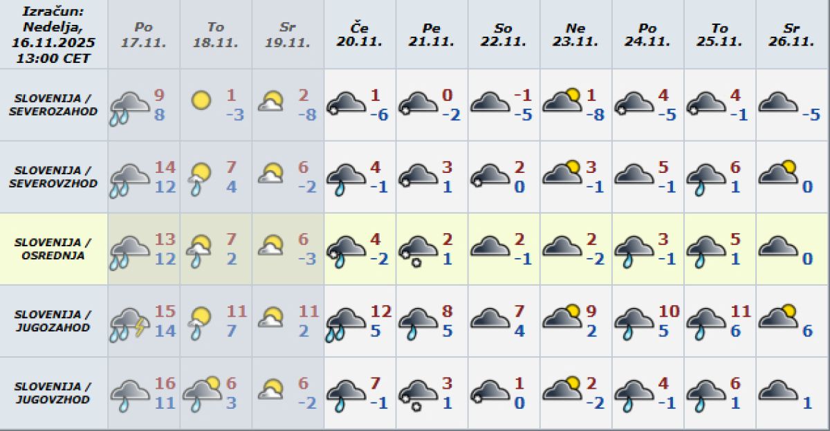 Padavine so se zjutraj širile nad vso Slovenijo, ob morju pa se pojavljajo tudi nevihte. Sicer pa bo čez dan še naprej pihal topel jugozahodni veter. Najvišja dnevna temperatura bo od 11 do 17 stopinj Celzija.