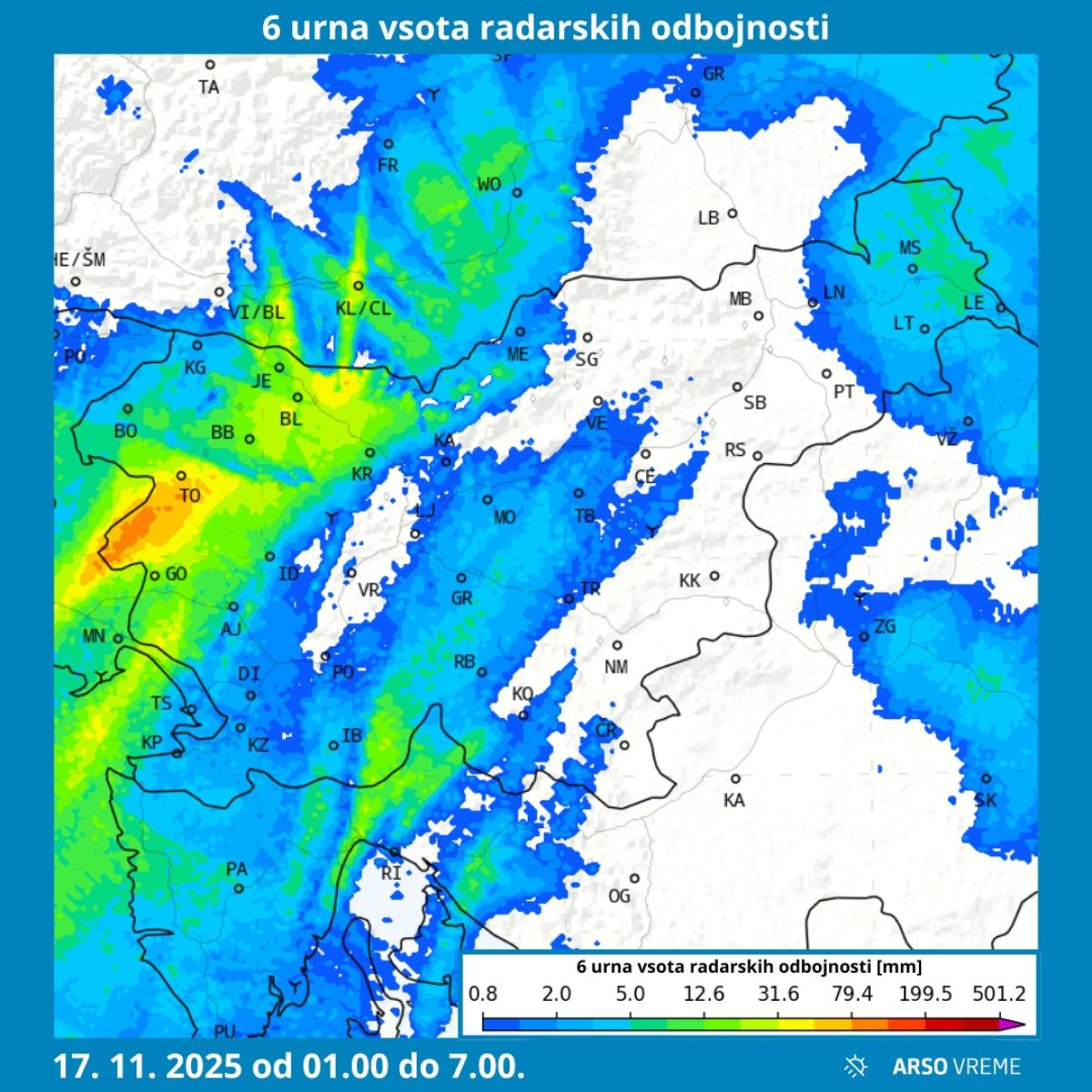 Je pa danes ponoči, torej še pred prehodom vremenske fronte, s svojim vplivom jugozahodni veter za obilico padavin poskrbel predvsem v pasu od Goriških brd proti Tolminu. Kot poroča Agencija RS za okolje (Arso), je v 12 urah tam padlo tudi več kot 100 milimetrov padavin, največ na Voglu (121 milimetrov) in v Tolminu (115 milimetrov).