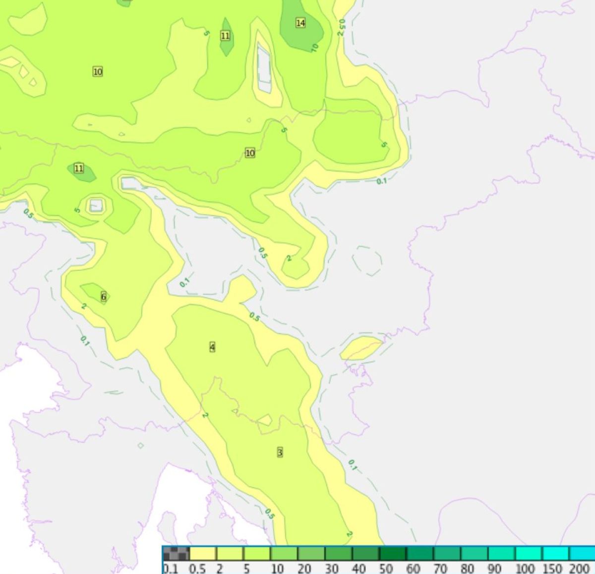Izračuni Arsa kljub temu kažejo, da se bo zvečer in v prvem delu noči meja sneženja v notranjosti Slovenije lahko spustila do nadmorske višine med 400 in 700 metri, nekaj več snega, in sicer od 5 do 10 centimetrov, pa bo verjetno zapadlo le nad okoli 1000 metrov nadmorske višine.