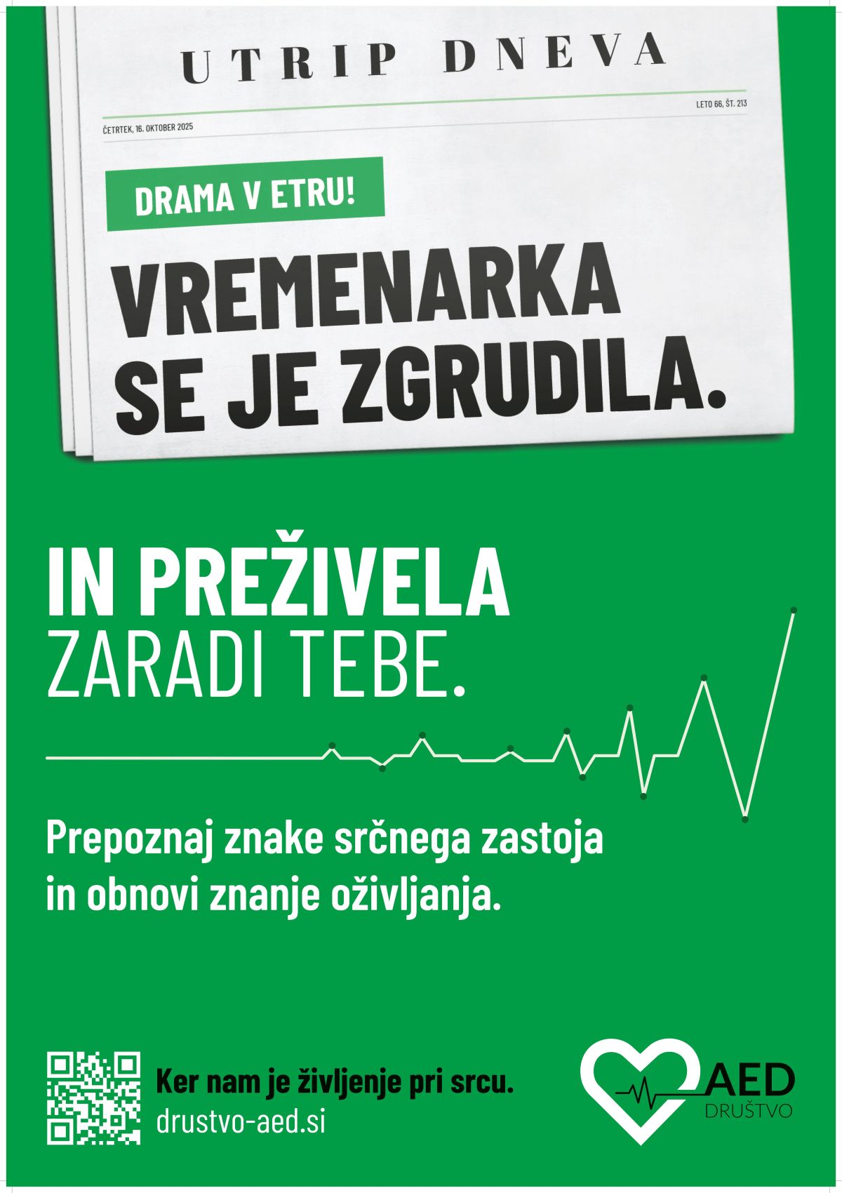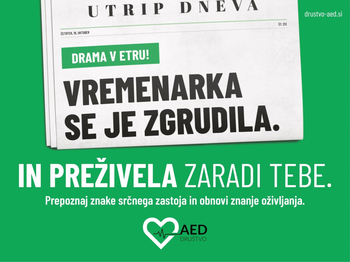 Večer pred svetovnim dnem oživljanja, ki ga obeležujemo 16. oktobra, se je med televizijsko napovedjo vremena napovedovalka nenadoma zgrudila. Gledalci so bili priča šokantnemu prizoru, ki se je razpletel v prikaz pravilnega postopka oživljanja z uporabo AED. Šele ob koncu je vremenarka sama razkrila, da je šlo za simulacijo, namenjeno ozaveščanju javnosti o tem, kako dragoceno je znanje, ki rešuje življenja.