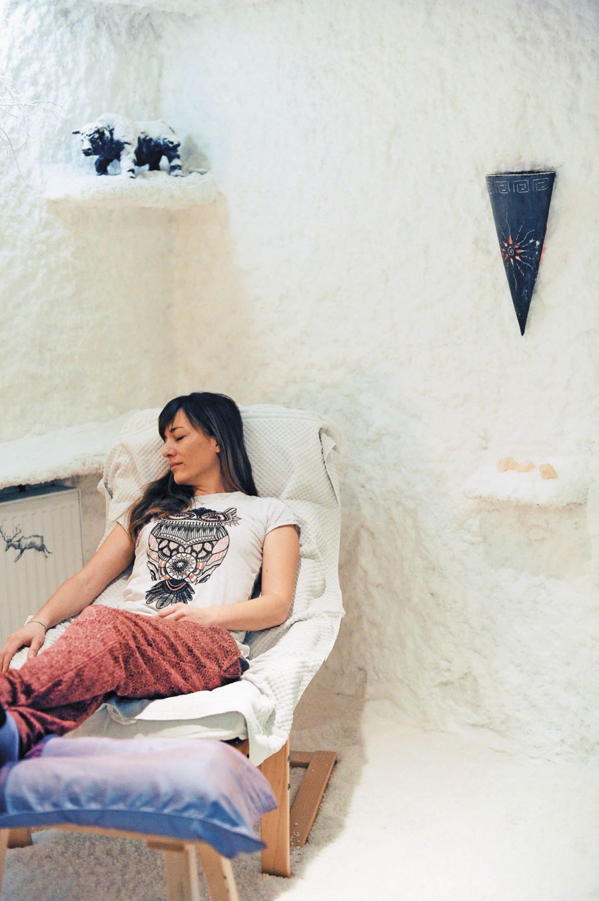 Predstavljajte si sobico, v kateri lahko v krogu, druga ob drugi, sedi le šest žensk. Toplo je, diši po soli in eteričnih oljih. Pridušena svetloba in nežna glasba božata dušo, sol, v katero se pogrezaš, pa začuda daje občutek varnosti. Vse je snežno belo. Počutiš se kot v maternici.