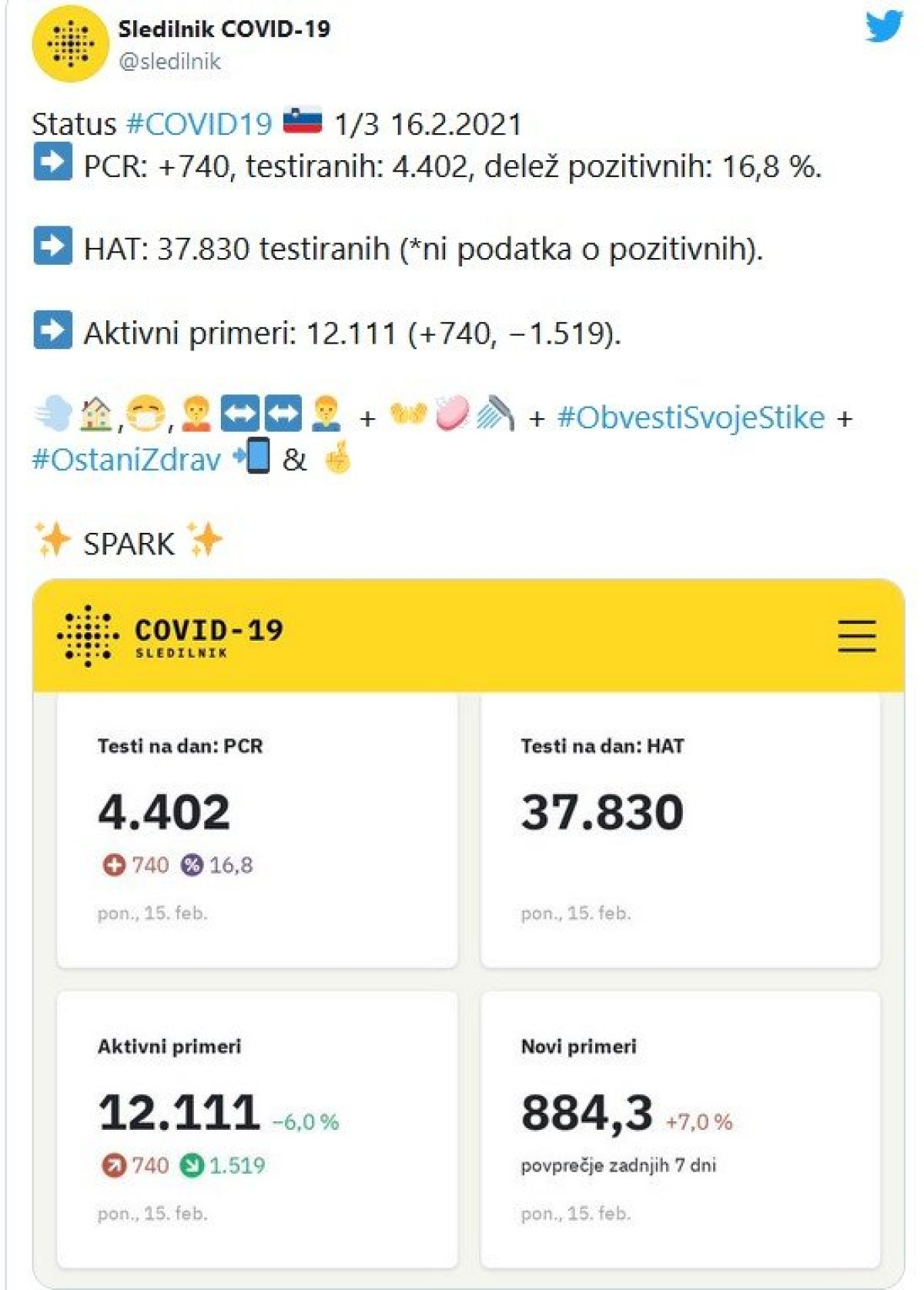 Podatki Sledilnika za covid-19 razkrivajo, da so v Sloveniji včeraj ob 4402 opravljenih PCR testih potrdili 740 novih primerov okužbe s sars-cov-2. Delež pozitivnih testov je bil 16,8-odstoten. Sedemdnevno povprečje novih primerov okužbe se je sicer povečalo za sedem odstotkov, in sicer na 884 (uraden izračun Nacionalnega inštituta za javno zdravje še ni znan), a je to posledica prazničnega ponedeljka prejšnji teden, ko smo slavili Prešernov dan in je bilo skupno odkritih le 337 novookuženih. Včeraj je bilo sicer opravljenih tudi 37.830 hitrih testov, a so ti odslej z vidika statistike nepomembni, saj vse pozitivne hitre teste potrjujejo s PCR testi, tako so v današnji rezultat vključeni tudi morebitni pozitivni hitri testi iz nedelje. Število aktivno okuženih se je po podatkih sledilnika znižalo na 12.111.