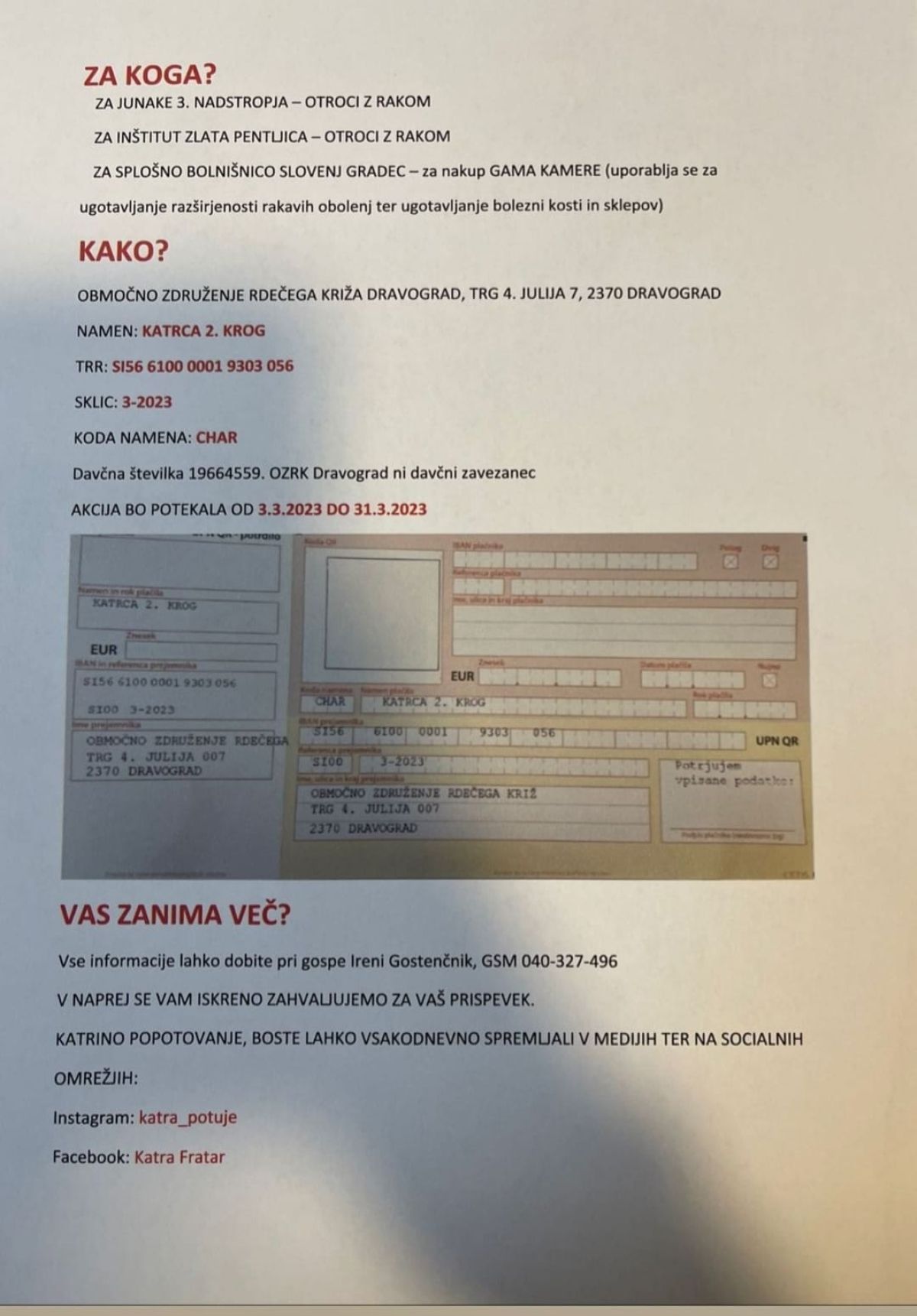 »Eden tistih, ki bo namenil kateri koli znesek na posebej odprt račun za otroke z rakom in SB Slovenj Gradec, dobi "Pahorjevo" Katrco,« je danes prek Facebooka sporočil tudi legendarni novinar TV Slovenija Slavko Bobovnik, medtem ko so bratje na profilu Katra Fratar zapisali, da ima »vsak izmed nas možnost, da postane njen nov lastnik!« Dodali so, da se »prostovoljni prispevki in njegovi vlagatelji skrbno ter sprotno beležijo. Vsakemu izmed vas se iz srca zahvaljujemo, saj samo skupaj zmoremo, za naše borce!!!«