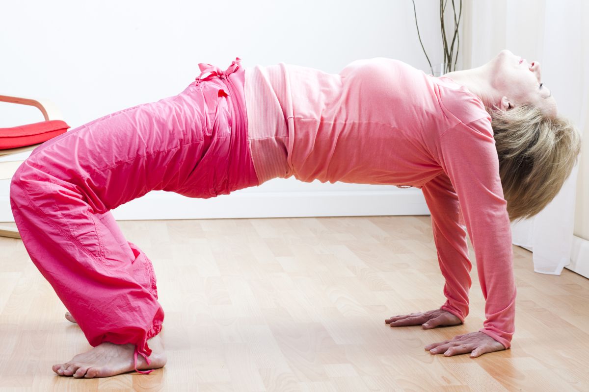 Sedimo na tleh, stopala so v širini bokov, dlani na tleh ob stegnih, glava pa na prsih. Vdihnemo in hkrati dvignemo telo naprej in gor, glavo potisnemo nazaj in naredimo most.