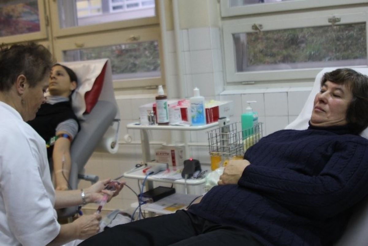 Na Centru za transfuzijsko dejavnost v Splošni bolnišnici Novo mesto je danes zjutraj že stotič po vrsti darovala kri Marija Krnc iz Grčvrha pri Mirni Peči. To dragoceno življenjsko tekočino redno daruje in ji pomeni dober začetek delovnega dne, tako je bilo tudi danes. Kljub jubileju gre popoldne v službo. 50-letna gospa je zaposlena je v čistilnem servisu v Novem mestu.