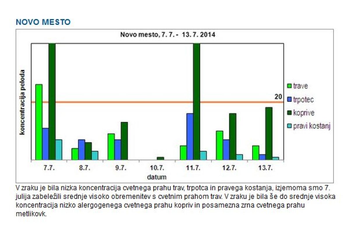 V zadnjih sedmih dneh je bila na območju Novega mesta tako izmerjena nizka koncentracija cvetnega prahu trav, trpotca in pravega kostanja, izjemoma so 7. julija zabeležili srednje visoko obremenitev s cvetnim prahom trav. V zraku je bila še do srednje visoka koncentracija nizko alergogenega cvetnega prahu kopriv in posamezna zrna cvetnega prahu metlikovk.
