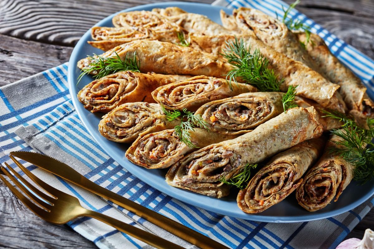 Zmešamo žlico moke, jajce, sol in 40 ml sirotke. Pustimo, da nabrekne. Zelenjavni obrok deset minut kuhamo v 100 ml zelenjavne juhe. Zelenjavo odcedimo, ohladimo in zmešamo z dvema žlicama že pripravljenega solatnega preliva. Iz testa spečemo dve palačinki. Napolnimo ju z zelenjavo.