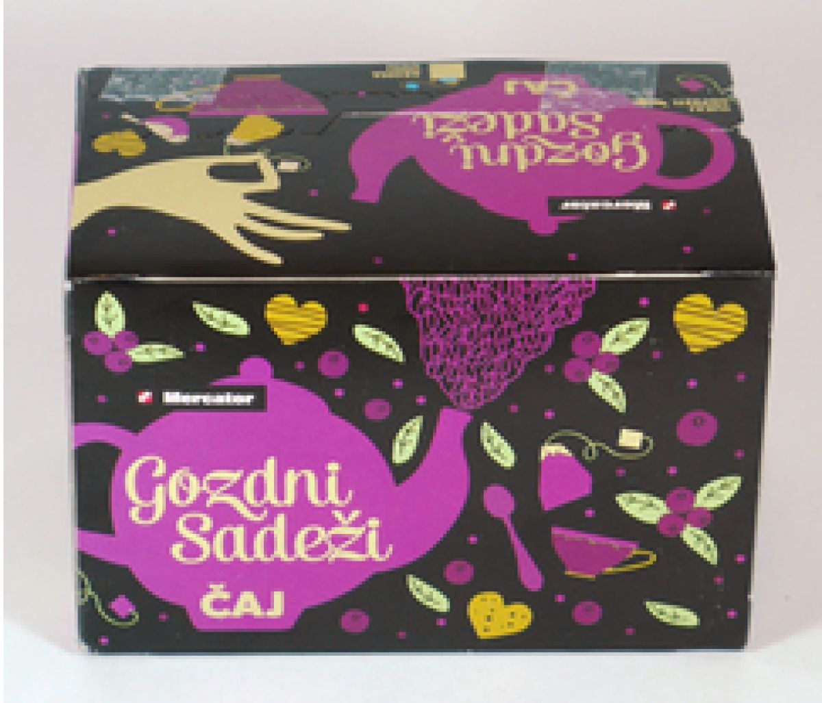 Mercator Mešanica zeliščnega čaja, aromatizirana z gozdnimi sadeži, brusnico in jagodo. Vsebuje 4 % aronije, 3 % črnega trna in 1 % borovnic. Dodane so arome. Neto količina: 40 g. Št. vrečk: 20. Cena: 0,75 €