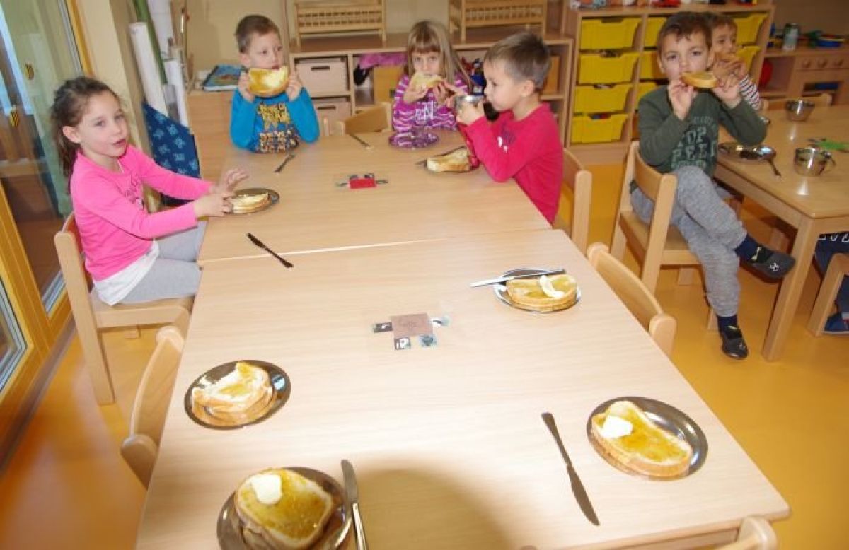 Tak zajtrk so si privoščili tudi v Vrtcu Čebelica Šentjernej, ki od nedavnega domuje v novih prostorih. Kot je povedala ravnateljica Anica Srpčič, so živila iz lokalnega okolja, za kar se trudijo tudi sicer. Njihovi otroci imajo pogosto na jedilniku med domačih čebelarjev in jim je zelo všeč.