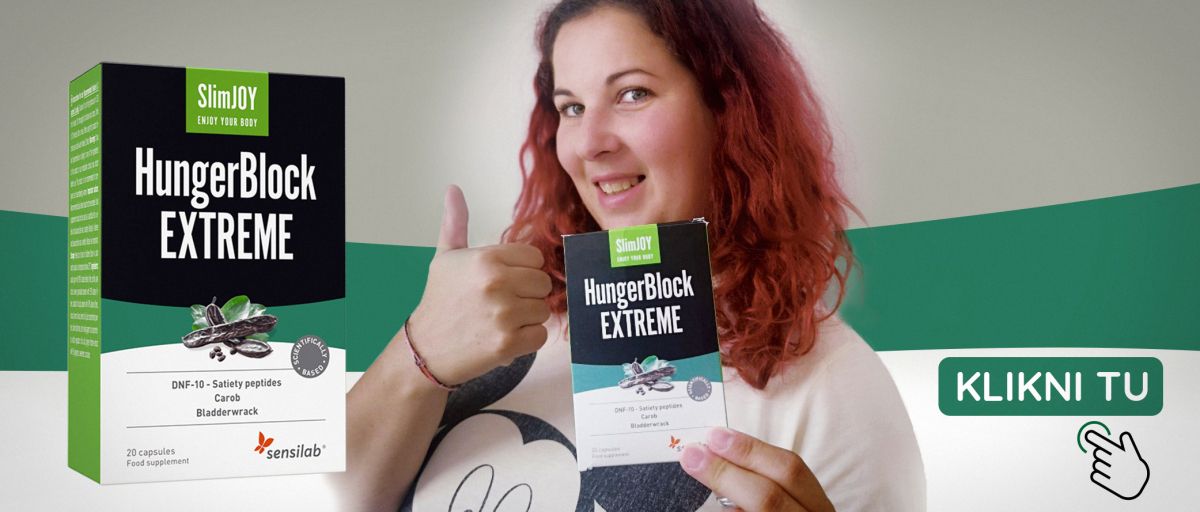 Pri Sensilabu smo razvili revolucionarni zaviralec apetita z naravnimi sestavinami, kot sta rožičevec in rjava alga. Deluje tako, da vašim možganom pošlje informacijo, da niste več lačni. S kapsulami HungerBlock EXTREME tako lahko zmanjšate vnos kalorij tudi do 600 kcal na dan! Kapsule so navdušile že ogromno Slovencev.
