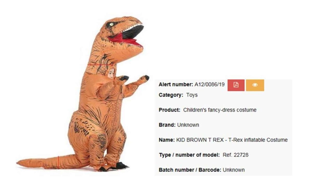 Pri omenjenih pustnih kostumih manjka opozorilo glede nevarnosti v bližini ognja, kar lahko predstavlja tveganje za zdravje, pri kostumu dinozavra pa obstaja tudi nevarnost zadušitve s kapuco.